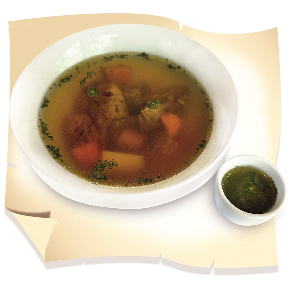 Наваристый бульон с томлёными говяжьими щёчками и овощами. Подаётся с фирменной заправкой
